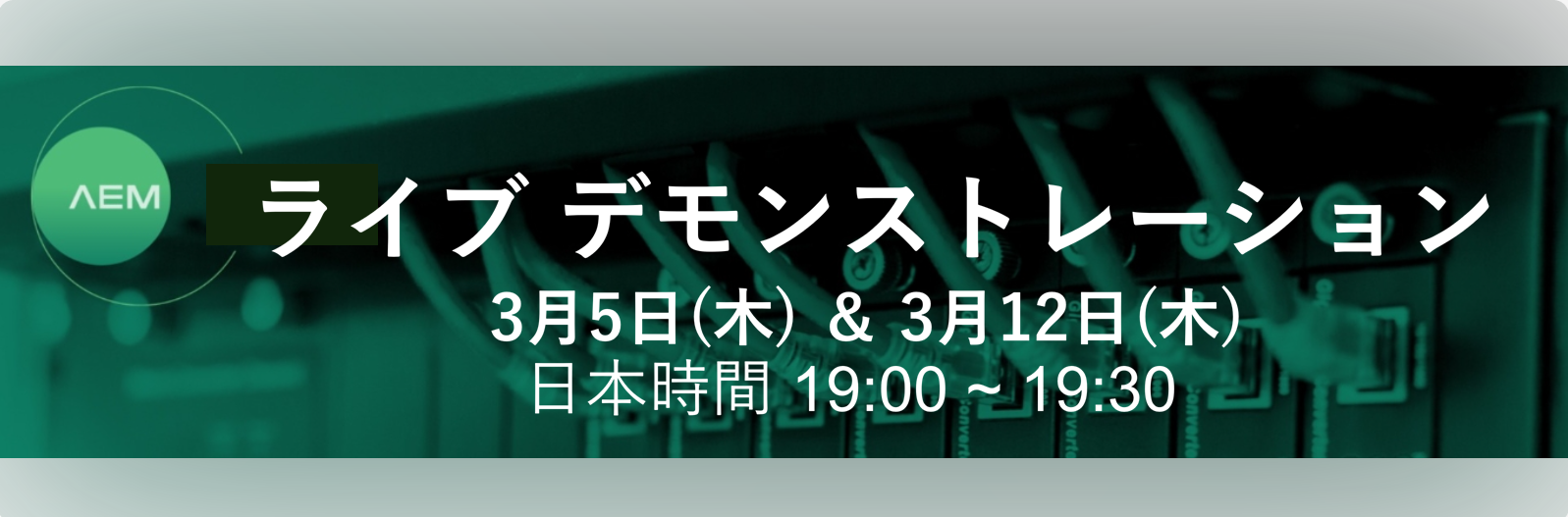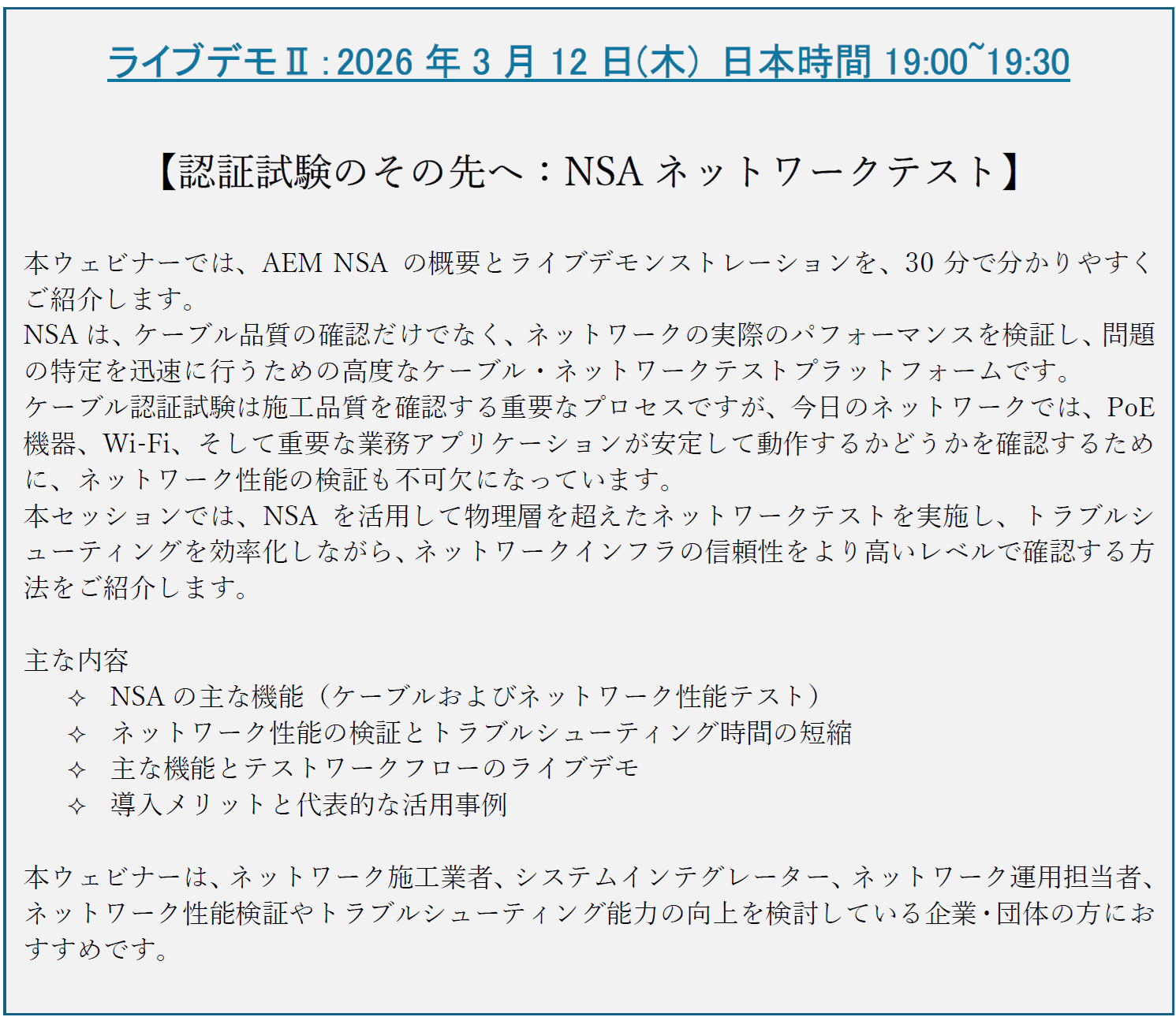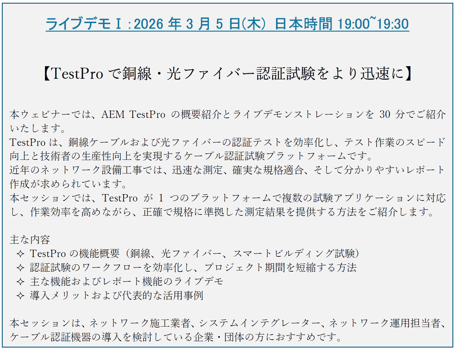 TestPro および NSAの製造メーカーである、AEMによる 30分間のライブデモンストレーションを、2週に渡りテーマを変えて開催いたします。多くのかたのご参加を、心よりお待ちしております。